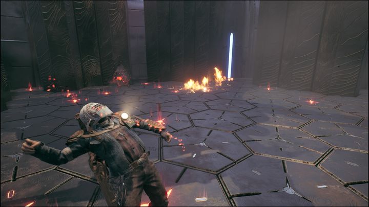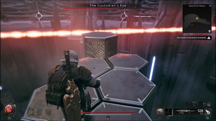 - Horizontal laser - The Custodian's Eye moves the arena, raises some platforms, then quickly sweeps twice with a red laser in both directions.