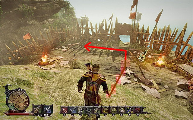 I recommend that you approach the second artifact (point 2e on the map) from the South. Climb the rocks and reach the hole shown in the above screenshot. Find the Liana here and interact with it. After you climb down, start sneaking and locate the second artifact (Skull Thumper) (100 Glory Points). After you collect it, use the liana again and leave the encampment. It is a good idea to return to Kalil (point 2c on the map). Tell him that you have retrieved the artifact and found Namik's corpse. You will receive 157 gold pieces from the gnome.