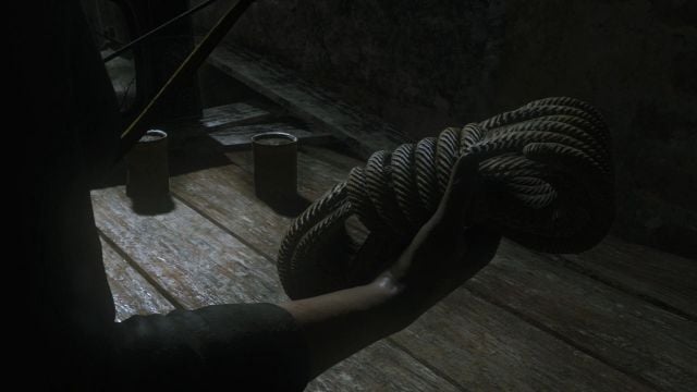Cross the hole in the wall, into a small room. In here, you will find a new bow and a rope. From now on, you can attach rope to an arrow and shoot it at specific spots to get into inaccessible areas.