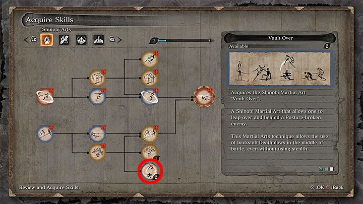 By default, Backstab Deathblow can be used only while sneaking - when you get behind an enemy's back. However, there is a way to use this skill during a fight - you need to purchase a certain ability. You get it by purchasing Vault Over skill in the Shinobi Arts tree. This skill is worth 2 skill points. However, you need to purchase two other skills first before you are able to get it.