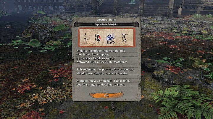 Puppeteer Ninjutsu is another technique that you can use after a Backstab Deathblow. This ninjutsu requires 5 Spirit Emblems. Capture Folding Screen Monkeys in the illusion to unlock this skill. You visit that illusion in Senpou Temple (this is part of the main storyline).