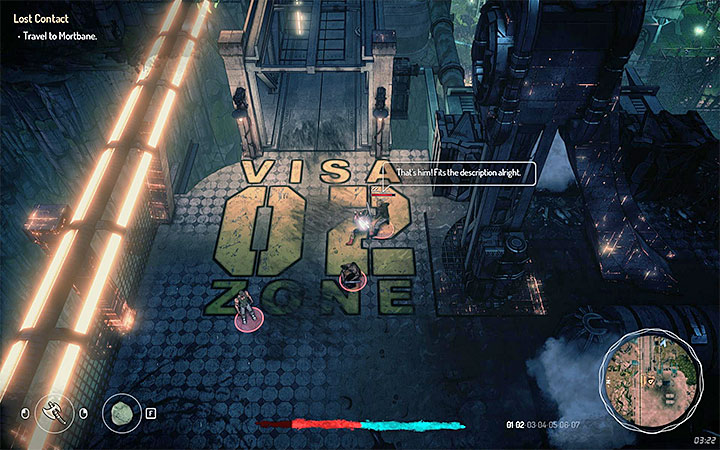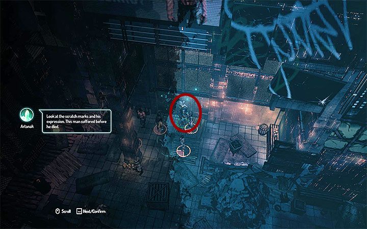 Once the conversation is over, hide in the garbage. Two biomants should remain in the building. Don't attack them, as it might attract attention of additional enemies. It's best to sneak past them and use invisibility to prevent the enemies from locating you. Use the detection mode to find potential traces. You don't have to examine all of them - you only need to check the corpse shown in the above screenshot. Once you're done, leave the crime scene.