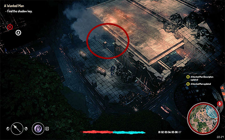 You must now investigate the first crime scene. This is a restricted area, but you can sneak inside. Reach the roof of the building and use the back entrance. You have to start sneaking here to prevent the technomagi and biomants from detecting you. Take a position from where you can safely eavesdrop on the conversation.