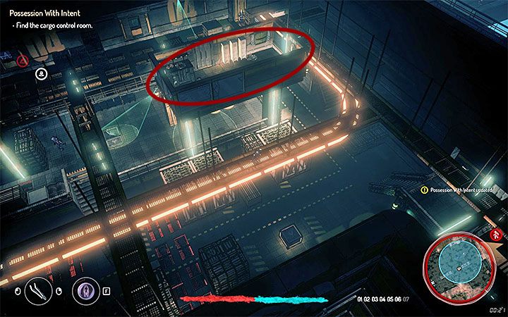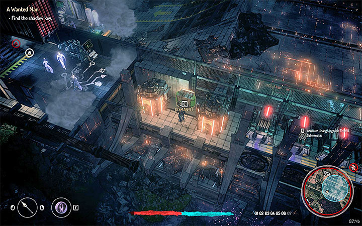 You have to reach the control room. It is located on the upper floor, in one of the corners (the picture above shows that place). Climb the stairs and walk on the balconies. However, if you need to use stealth then you should sneak on the metal elements right under the ceiling. Wait until the guard moves somewhere else and enter the control room. You have to hack into the big computer. Watch the short cut-scene and go back to the quest giver. You receive 100 auryte and Stun Dart Schematic.