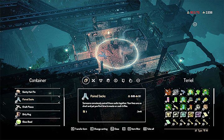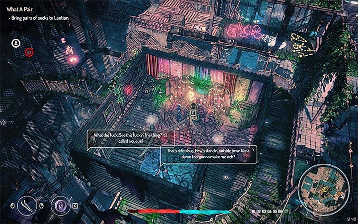 You must now visit the bar where the technomagi organize a birthday party. Only members of this faction have the right to enter, which is why you must acquire any technomagi outfit. Speak with Ganler who celebrates his birthday. He won't be talkative at first. Order some drinks (each one costs 4 auryte) for him and you will learn about an older crime scene. It would be a good idea to visit it immediately, although it's an optional step (skipping it will lock one of the endings of the quest). There is a group of homeless people located there, but you don't have to fight them. Focus on examining the human sculpture shown in the picture.