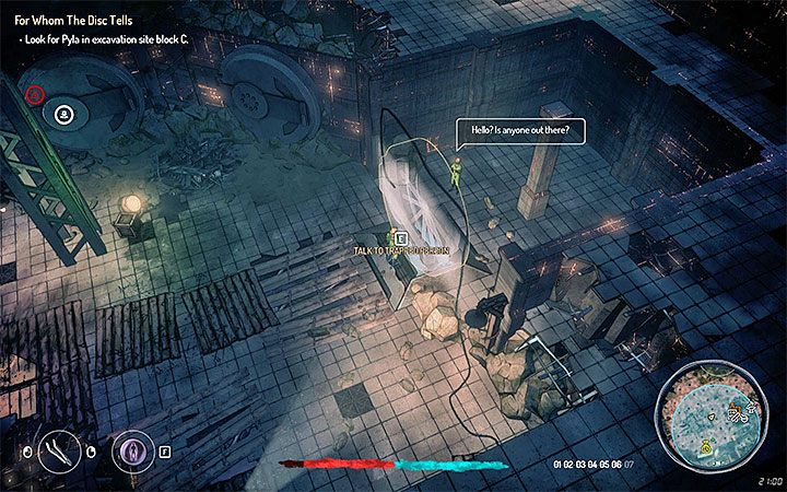 Your goal is to reach excavation site block C (you can determine Pyla's location by yourself or you can speak with Seok, one of the workers). This block is located on the lower floor, in the center of the excavation site. Pyla is imprisoned in the vault presented in the picture - speak with her. Hack into the terminal on the wall and open the vault (activate Sense Mode and follow the cable).