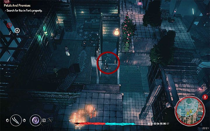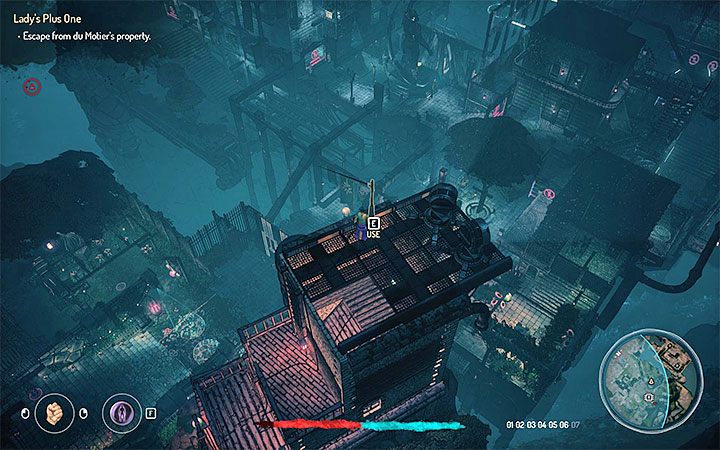 You now have to leave the property. The area is patrolled by alarmed guards. Again, rely on invisibility while you are going through the basement and leave the building. The main entrance is guarded. Reach the tower located in the south-west corner of the garden (enemies can attack you upon detecting Teriel - the elegant set doesn't "protect" you anymore!). Climb up, reach the terminal and hack into it. Complete a hacking mini-game and use the rope presented in the picture. Use it to slide down. Don't forget to collect Teriel's weapons from the chest.