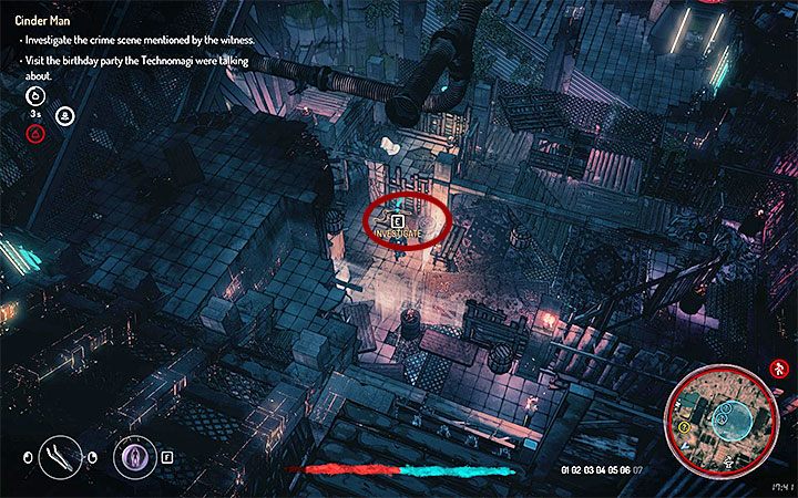 Starting from this moment, you will see purple technomore particles while in the detection mode. You must now follow them, as they will lead you to the Cinder Man's hideout. Always start by looking for new particles from the blue circle on the map, as only then the circle will change its position, informing you about the location of the next ones.