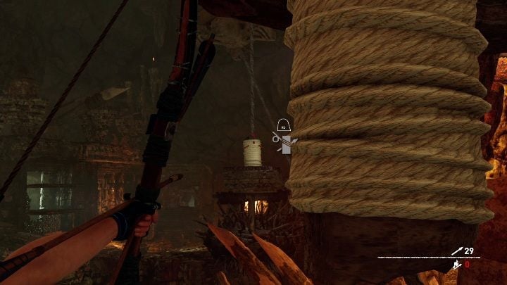 There you have to wait until the right moment. When the trap is close enough, use the bow to shoot the rope and change its movement direction. This way the trap will hit a pile of things on the road and allow you to move on.