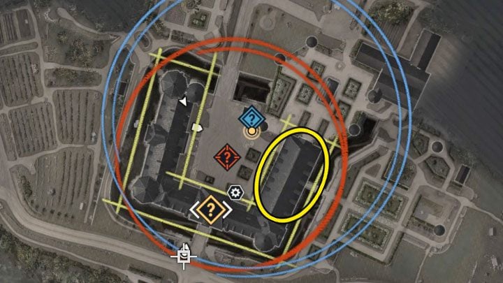 The mission target takes part in the meeting in the ballroom in the eastern part of the chateau - this place is marked in yellow in the picture above.