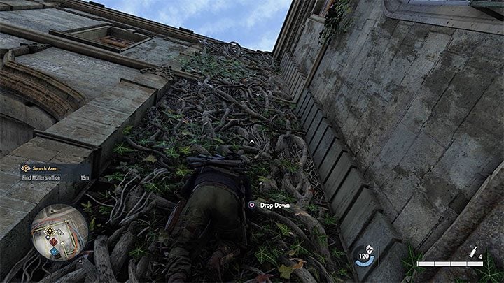 Instead, you can reach the balcony above the ballroom. Your first task will be to get to the upper floor of the chateau. For example, you can climb the vines in the main courtyard.