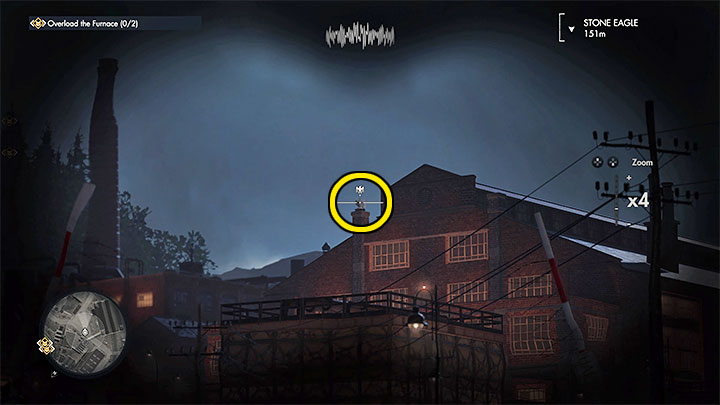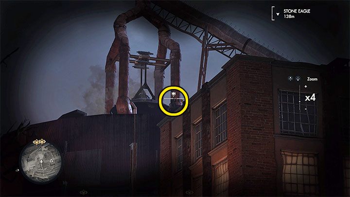 The stone eagle is on the southern building outside the mission area. However, this is not a big problem, because you can position yourself about 150 meters north of it, i.e. near the evacuation point and the passage to the building with the furnace.