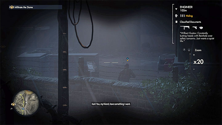 - Locate the engineer who has the document on him. Use your binoculars to tag and identify him (picture 1). Get rid of him however you want and then search his body .