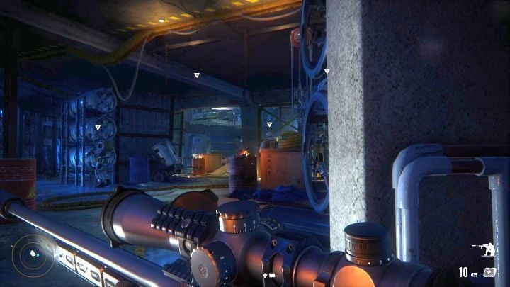 The objective of your mission is at the very top of this room - you need to get there. Try to eliminate enemies quietly - if they walk in pairs, separate them by throwing more stones. You have to climb up the stairs to the top (starting from the ground floor), and then climb up the crates located in the center of the room. From here you only need to run up the stairs to get to the top.