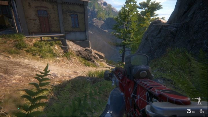 As soon as you are able to control the character, you will see that the scenery has changed significantly - the action takes place on the territories covered with vegetation, there is no snow here. Go north and lie down on the mountainside - the first enemy outpost is nearby. Start with killing a sniper lying in the grass north of your location. Then, eliminate another standing in the window of a building at the end of that facility.