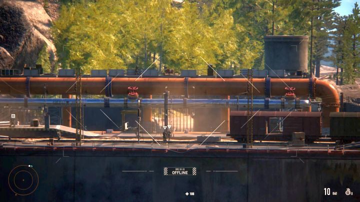 You reach a narrow passage patrolled by enemies. The drone is unavailable now - the jammer nearby can't be disabled. Luckily, it doesn't affect the ability to mark targets. There are several enemies, one turret and a sniper on the observation tower.