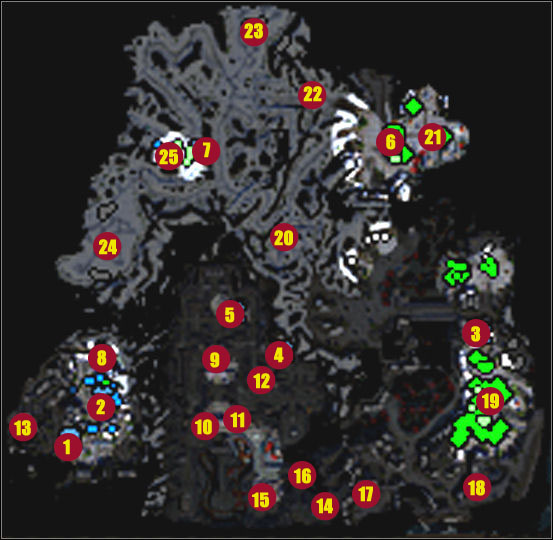 ![]() | When you destroy Northern camps move your soldiers to the West. But before you enter the mountains recruit a group of Mounted Crossbowman. It's time for a serious offensive. Attacking the base defended by Lizards and Harpies (20) is extremely difficult because it's guarded by lots of towers. Order your giants to destroy towers, let Mounted Crossbowman to fight Harpies. Your heroes should support giants and crossbowman as well. When you destroy the first line of Ice Witch's defense, send riders to the Thane Wulfgar's base (21). Since now you may use Dwarven units (especially catapults). Now spend some time for fortifying your headquarter. There are two camps of beasts that try to destroy your base. You should build a few towers and recruit a group of defenders. Now try to attack the main camp of Ice Witch. |