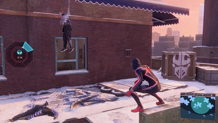 1) One of them is located on the roof of a building on the border with Chinatown. Yank the door with your web (L1 R1) to get to the cache.