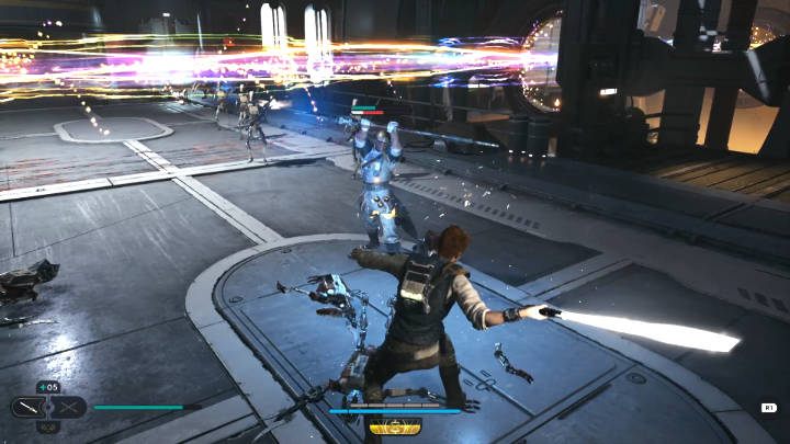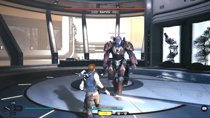 Another boss you encounter in the Star Wars Jedi Survivor game is Rayvis. The fight against this opponent is divided into two phases. Rayvis is a formidable opponent, especially on higher difficulty levels, so we advise playing defensively, blocking regular attacks (as often as your block bar will allow you to do) to interrupt the boss' attack. Watch out for red attacks - dodge them and deliver a blow when the opponent stands still.