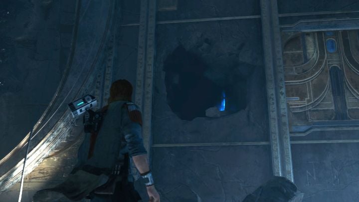 Grab a large boulder with the Force and push it toward the weakened wall in the picture. An opening will be created, behind which there is an inactive orb amplifier.
