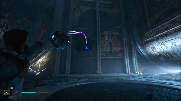 Reach the first orb now. Catch the orb with the Force and throw the ball through the large hole shown in the screenshot to the first part of the room.