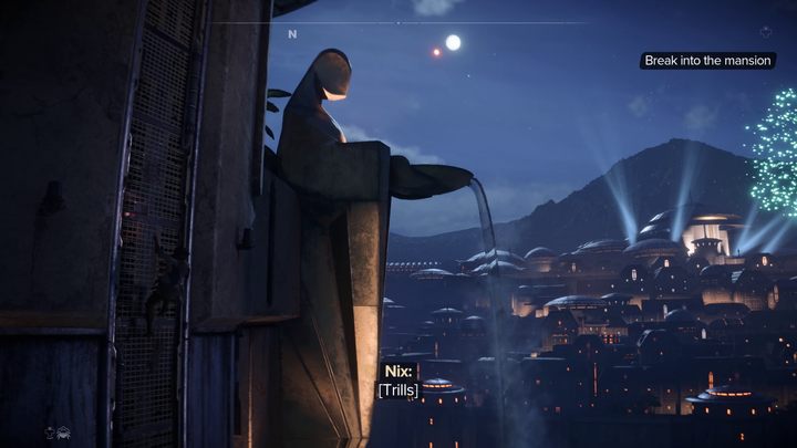 Follow the marker. The bouncers standing in front of the entrance will refuse you entry, so you will have to enter by trickery. Turn into the street to the left of the entrance and then find a garage with a slightly open gate. You will recognize the correct place by the cables leading to the room and the speeder parked inside. You will pass under the gate by crouching.