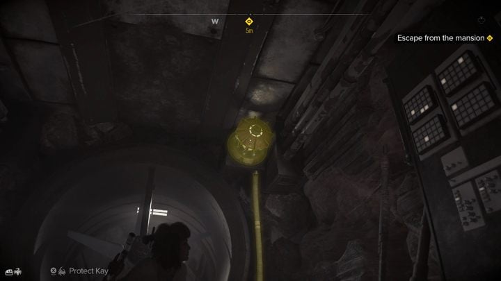 By holding down the up button on the controller's D-pad you can momentarily move the mission marker from the compass to the space around Kay. This will help you navigate the immediate surroundings.