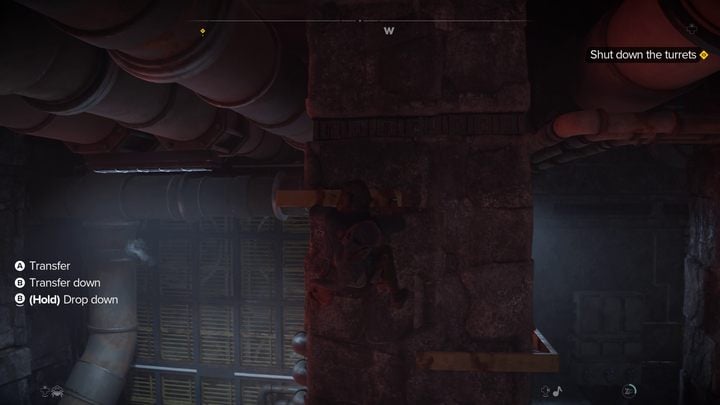 The second power source to destroy is located on the mezzanine. To access it, send Nix to activate the button that lowers the ladder for you. Climb up and then shoot the machinery in the ventilation shaft.