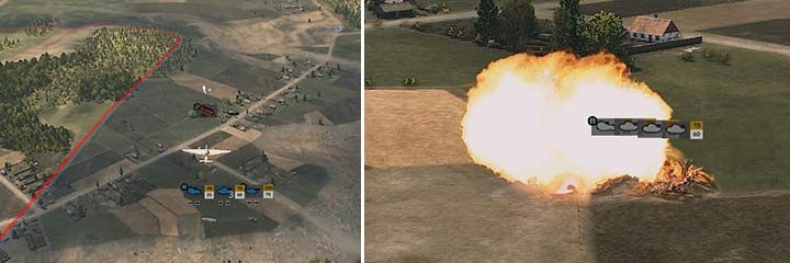 You must remember that once you have assigned an enemy unit to your target, your plane will drop bombs on the specific position, even if enemy disappears from sight. Then the bombs will be dropped on the last known position. Sometimes this feature is very useful because enemy troops quite often don't change their location. In other situations it will be better if you stop your attack or point to another target (in case of shooting at a fast enemy unit). Also, you can bomb a column of trucks or tanks, but you have to do two things to make the attack successful: at first, set the bomber to fly in the same direction as the incoming enemy column. It is best to choose a long way of the path, if the enemy column suddenly change its route. Secondly, you need to select the first vehicle as the target. The bombs won't hit the front of the army's column, but they'll explode on the other vehicles. Such an attack requires micro-management, but it is very effective.