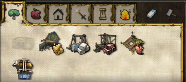 Industry buildings are used for basic resource production, such as wood, iron, stone or pitch. From this building tab you can access buildings such as: Stockpile, Wood Camp, Stone Quarry, Iron Mine, Ox Tether and Pitch Rig.
