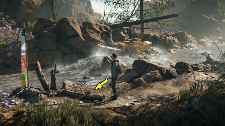 Use a machete on a tree by the river. Follow the directions on the screen and overturn the log. Then walk to the other side of the river.
