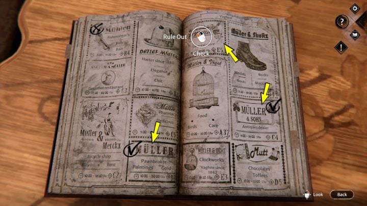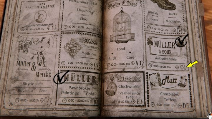 Each of the marked shops in the phone book has an assigned letter and number in the lower right corner.