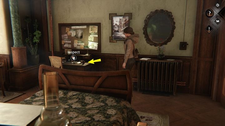 Go up the stairs to the upper floor and look into the room on the right. Examine the desk, pick up the wallet and the mysterious painting.