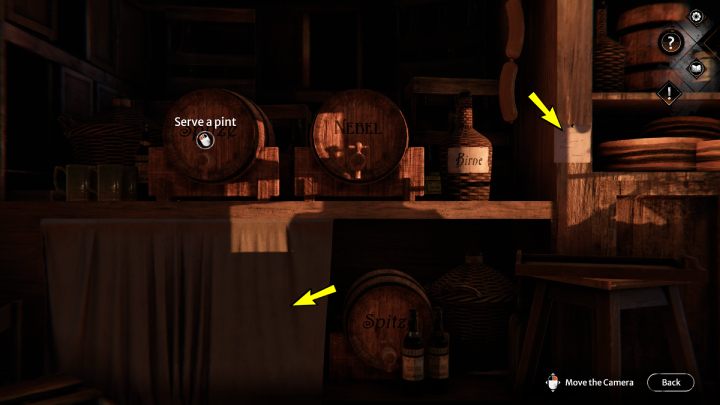 To prepare an order, click on the appropriate beverage and then unscrew the valve or bottle cap. You will find a spare barrel with Nebel written on it behind the curtain.