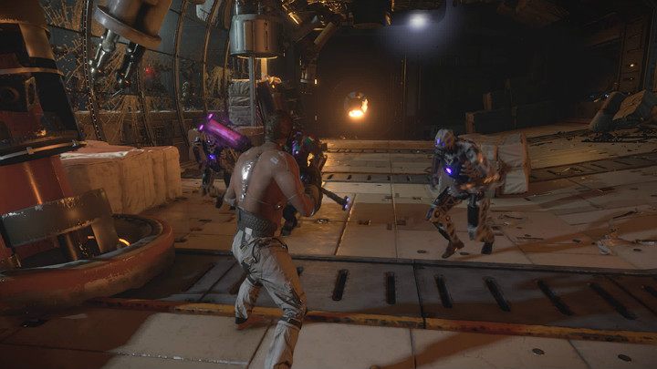 Monica is activating the self-destruct protocol - you need to get to the escape pod as fast as possible. Tony tries to hack to the locked door. Your task is to fight the Synthoids. Since you don't have the shield, use dodges and mix light attacks with heavy ones to create combos. After the fight is over, help Tony open the door.