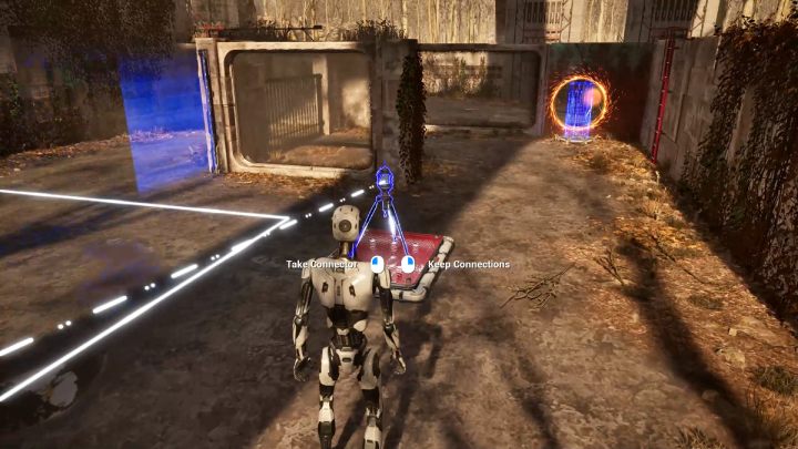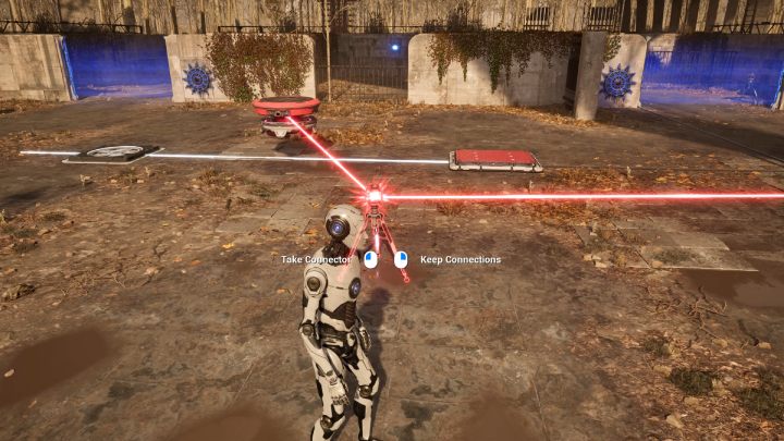 - Make connections between the first connector, the red button beyond the purple barrier, and the levitating platform.