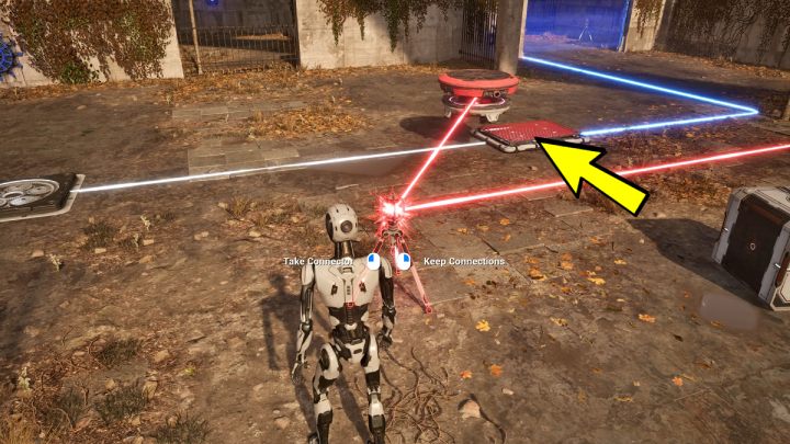 - Make a connection between the red laser, the levitating platform, and the red button by the levitating platform.