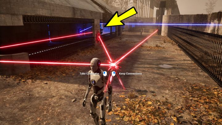 - Make connections between the red laser, the red button, and the connector by the levitating platform.