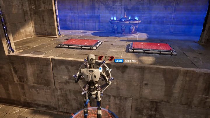 - Wait until the levitating platform reaches the end of its route and step on the second red platform.