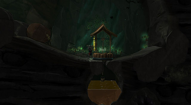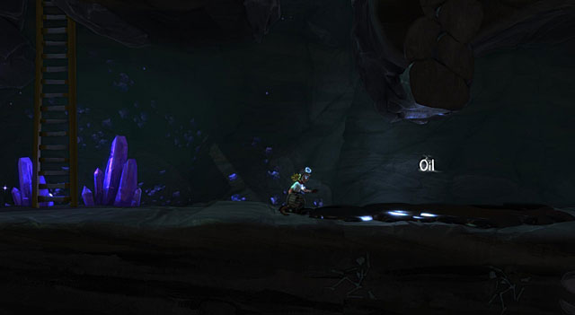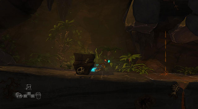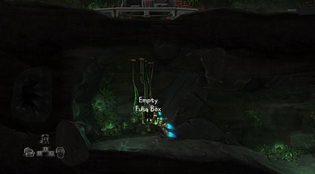 Go right. Behind the Time Machine you will find a ladder leading up. Climb it and afterwards move to the left. Your path will be once again blocked by stalactites and stalagmites. Phase through them to the other side. Eventually you should come across a large stone. Move it to the right, jump onto it and afterwards onto the platform above. Take the fuse from the Fuse Box and jump below. Drop down the Fuse for a moment and push the large stone into the pond on the right so it blocks the water dripping from the ceiling.