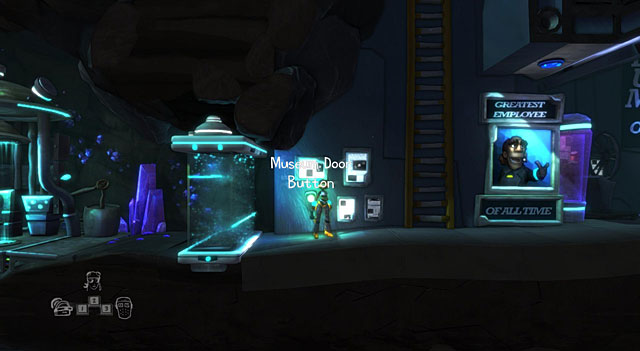 Use the time machine and you will be taken to the future. Head right, "phase" through the blue barrier and switch it off by using the Museum Door Button on the wall.