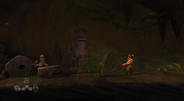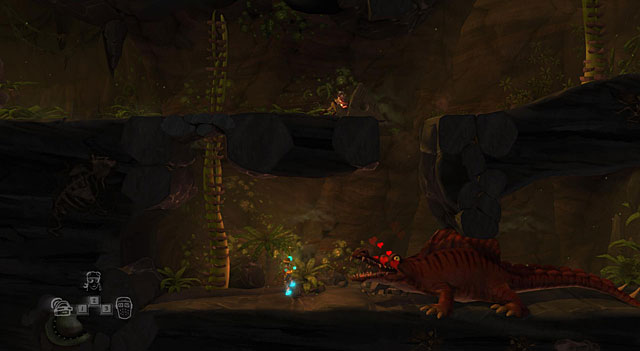 Move to the past with the traveler with the time machine and head down to the place where the live dinosaur is. Lure it to the left thanks to your scent. When it reaches the hole above, switch to the second character and push down the triangular rock onto it.