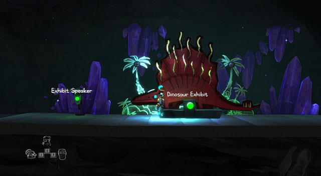 Move to the future with the traveler, head to the right and to the lower part of the complex. There you will find a dinosaur model. Press the Dinosaur Exhibit and the traveler will be sprayed with dinosaur pheromones. If you spray it on all three characters, you will receive an achievement.
