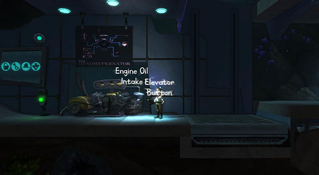 Move to the future with this character and pot the oil into the Engine Oil Intake to the right of the reception. Head onto the elevator platform and press the Elevator Button on the left.