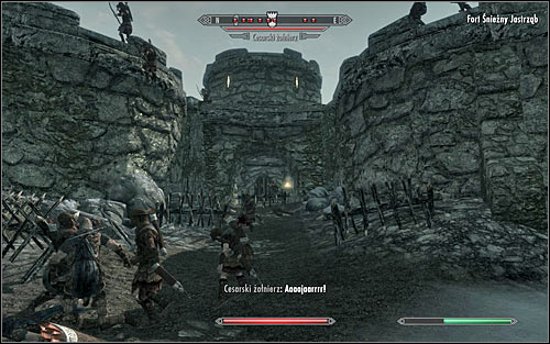 If you're planning to attack the Imperial Legion soldiers in close combat, use the main fort entrance and step into the fight (the above screen).