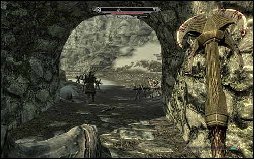 Luckily, you don't have to climb anywhere to get to your allies. Instead, stay on the hard-surfaced path that runs parallel to the mountain chain. Save the game and join the Stormcloak soldiers (the above screen), commencing the battle.