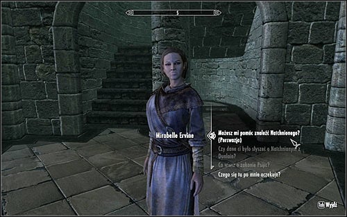 You can ask almost any Mage in the College for the whereabouts and details regarding the Augur of Dunlain, though real information can be gained only from two characters. The first of them is Mirabelle Ervine, although in this case you would need to have a very well developed Speech and try to convince her to tell the truth (screen above).