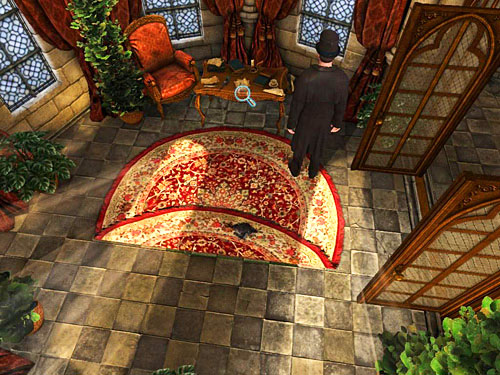 Then roll up a bit of carpet. Underneath Holmes will find a stain of ink and understand, that the carpet was turned upside down.
