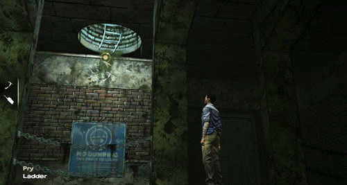 There isn't anything for you to do in the lower part of the tunnel. You won't manage to open the grate (Pick Up: Grate), nor pry it (Pry: Gate). You can look at the Broken Ladder but you won't be able to pick it up, either (Pick Up: Broken Ladder). As there is nothing else for you to do here, go to the upper part of the tunnel using the steps on the right or left.