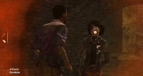 Only after that can you exit the passage way and enter the corridor. Go left until you get to Chuck's body. After the cutscene, look at the zombies in the distance and attack them (Attack: Zombie).